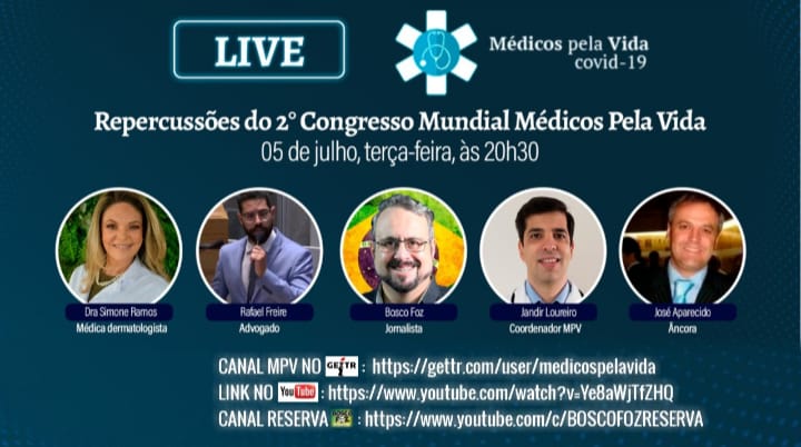 Você é nosso convidado para uma Live especial hoje, terça feira (5) às 20h30. Vamos falar das repercussões do 2º Congresso Mundial Médicos pela Vida que aconteceu em Foz do Iguaçu entre os dias 30 de junho a 3 de julho de 2022, reunindo especialistas cientistas e médicos de 20 países para debater a pandemia, o pós-vacina, suas consequências e o futuro  da medicina.